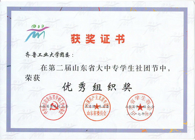 2016年,校团委为学习贯彻党的十八大和十八届三中,四中,五中全会精神,深入贯彻习近平总书记系列重要讲话精神和学校办学理念,进一步丰富学生第二课堂活动,通过加强学生社团建设,引导青年学生树立崇高理想,培养高尚道德品行,促进青年学生素质全面发展,在校党委和团省委的领导下 91香蕉,紧扣时代主题,以“齐鲁工业大学第25届科技文化艺术节”活动为载体,先后开展了歌手大赛,舞蹈大赛,小品曲艺大赛等30余项社团文化艺术活动,通过精心策划,层层选拔,最终推选了优秀作品和团队到省赛参与角逐,其中梅花桩社团提交的摄影作品《太极扇》荣获社团摄影大赛二等奖,艺术学院刘淼,姜芝林提交的软笔书法作品在社团书画比赛中荣获二,三等奖,工商管理学院代表队在啦啦操大赛中荣获三等奖,以及棋友协会,话剧社,曲艺协会等社团在相关比赛中荣获优秀奖六项,由于在整个活动期间积极配合,组织得力,最终我校团委被第二届山东省大中专社团文化节组委会评委“优秀组织奖”。
