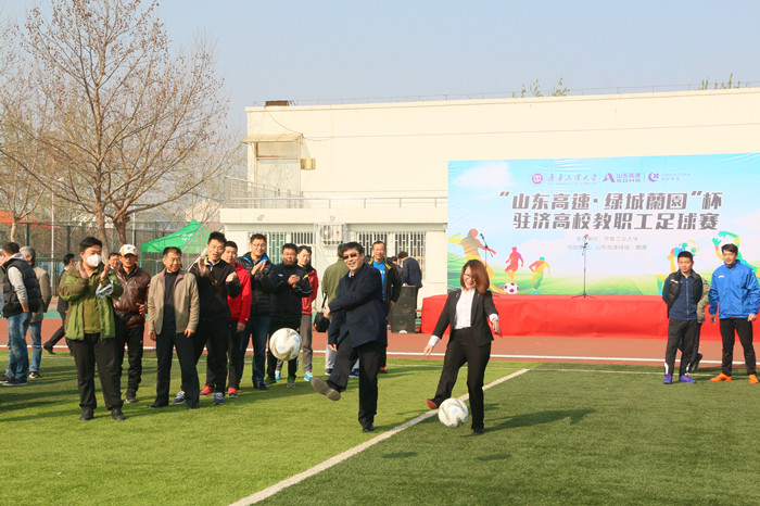4月1日,由校工会主办,山东高速地产集团,绿城管理集团承办的齐鲁工业大学“山东高速·绿城蘭园”杯驻济高校教职工足球赛在学校隆重开幕,副校长周有波,山东高速绿城管理集团蘭园项目营销总监张园园,山东师范大学 91香蕉视频,济南大学,山东女子学院,山东管理学院,山东工艺美术学院,山东农业工程学院6所高校的工会领导出席开幕式,开幕式由校工会主席冯喜平主持。