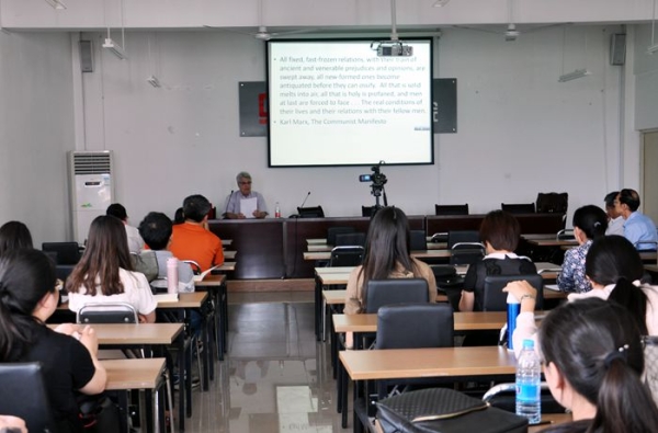 聘任仪式后,阮儒斯教授作了题为“A Discussion of Tom Robbins’ Novels and Contemporary Transcendentalism”《汤姆·罗宾斯小说中的现代超验主义》的学术报告,详细介绍了他的好友 91香蕉,美国作家汤姆·罗宾斯的主要作品,以及作品中体现的与爱默生,梭罗一脉相承的现代超验主义,包括现代超验主义与中国传统文化之间的紧密关系,报告内容丰富,深入浅出,颇具启发意义。
