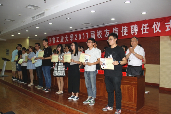 学生处处长刘传波宣读《关于聘任2017届齐鲁工业大学校友信使的决定》,决定聘任杨守全等149名毕业生为2017届齐鲁工业大学校友信使 91黄,合作发展处穆洪军副处长宣读《齐鲁工业大学校友信使联谊会章程》,并简要汇报了我校校友信使工程建设情况,与会领导共同为2017届校聘校友信使颁发聘书。