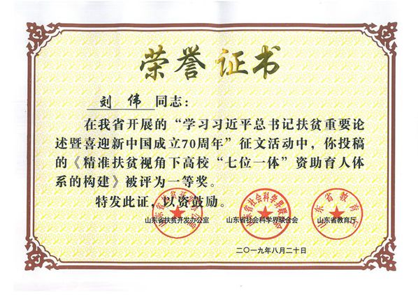 据悉,为深入总结全省精准扶贫精准脱贫理论创新和实践创新结果,省扶贫开发办公室,省社科联,省教育厅共同组织全省“学习习近平总书记扶贫重要论述暨喜迎新中国成立70周年”主题征文活动,共征集论文385篇,经过专家评审,评出一等奖10篇,二等奖20篇,三等奖40篇,由我校宣传部选送,刘伟撰写的论文《精准扶贫视角下高校“七位一体”资助育人体系的构建》结合我校资助育人工作实践,详细梳理了习近平总书记精准扶贫工作理念的科学内涵,精神实质及重要启示,创新性提出从“扶志,厚德,助困,强智,塑能,增质 91香蕉,求效”七个维度构建精准资助育人体系的实践路径,斩获一等奖。