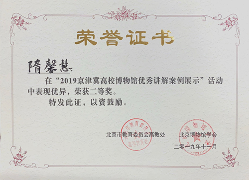 本次活动由中国博物馆协会,北京市教育委员会,北京市文物局,北京博物馆学会指导,京津冀高校博物馆联盟,北京高校博物馆联盟,北京高校博物馆专业委员会共同主办,活动自10月初在中国传媒大学正式启动,共有来自全国30余所高校博物馆的100余名讲解员入围本届活动初赛 91香蕉,经过专家点评,评委评选,最终有37件优秀作品进入复赛,校(院)博物馆选送的3名作品从讲解水平,稿件撰写,视频录制等方面均表现出较高水平,得到组委会的高度认可,最终,初次参赛并获得“最佳组织奖”荣誉称号,讲解员隋馨慧同学获得二等奖。
