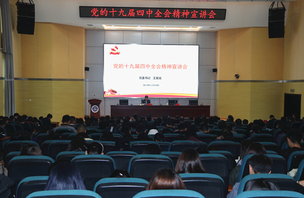 11月29日下午,校(院)党委书记王英龙在长清校区行政楼一楼报告厅向校(院)师生宣讲党的十九届四中全会精神,校(院)党委班子成员,全体副处级及以上干部,马克思主义学院教师代表,学生代表500余人聆听报告 91香蕉视频,报告会由党委副书记刘永波主持。