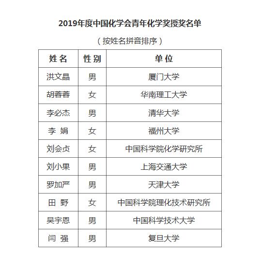 中国化学会青年化学奖设立于1983年,是学会最早设立的学术奖励,主要授予在化学基础及前沿研究领域,应用及工程工业领域或化学教育领域能够创新,改进并独立完成工作,年龄不超过35周岁的优秀化学青年工作者,中国化学会青年化学奖每年评选一次,每次评选不超过10人,截止2019年仅有328人获得此奖 91黄。