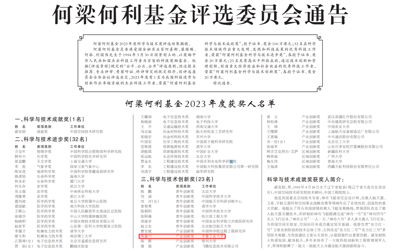 12月19日,何梁何利基金2023年度颁奖大会在北京钓鱼台国宾馆举行,中共中央政治局常委,国务院副总理丁薛祥出席颁奖大会并讲话,齐鲁工业大学(山东省科学院)生物基材料与绿色造纸国家重点实验室主任陈嘉川教授荣获何梁何利基金科学与技术产业创新奖 91香蕉视频,实现了校(院)该奖项零的突破。