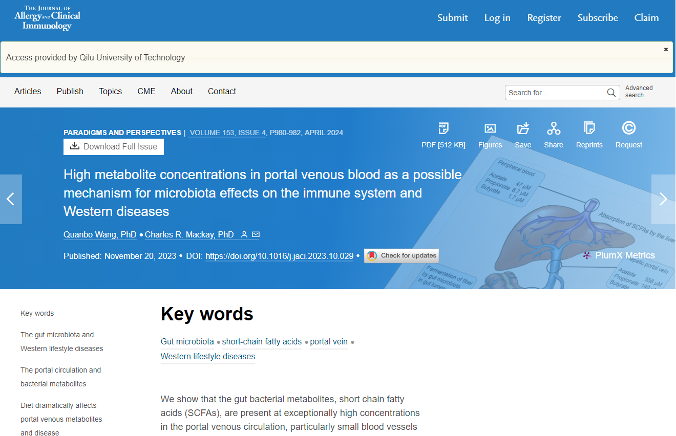 近日,齐鲁工业大学(山东省科学院)药学院的名誉院长查尔斯·麦凯院士领衔的研究团队,在肠道微生态与免疫系统相互作用领域取得了开创性的理论进展。该研究成果以“Highmetabolite concentrations in portal venous blood as a possible mechanism formicrobiota effects on the immune system and Western diseases”为题,成功发表在美国过敏、哮喘和免疫学学会(AAAAI)旗下顶级期刊《Journal of Allergy and ClinicalImmunology》(IF:14,29,中科院1区),标志着校(院)在该领域的研究实力已达到国际先进水平。 91香蕉视频。