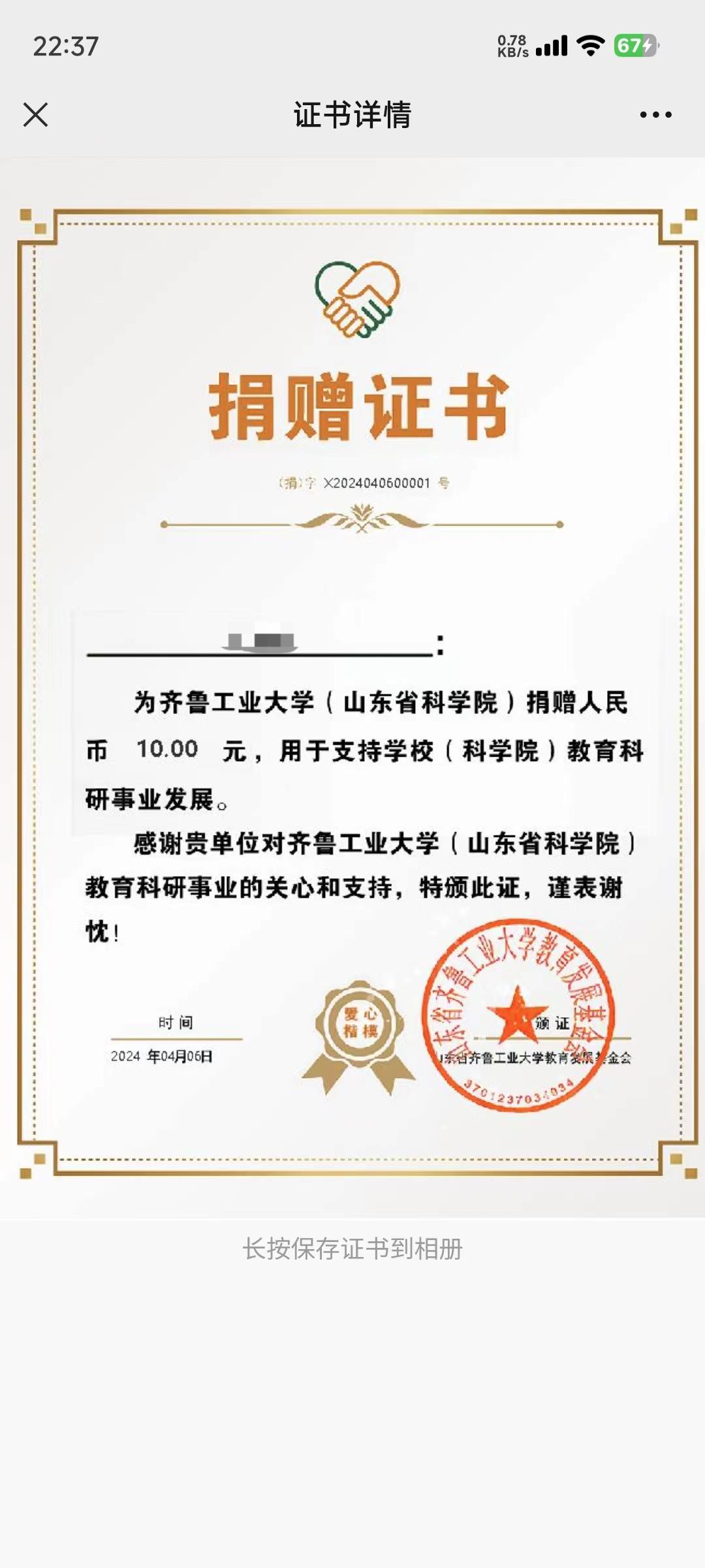按照齐鲁工业大学教育基金会的管理办法,捐款后可登录齐鲁工业大学校友众筹平台自行打印捐款证书(详细步骤见附件),如您需要纸质证书,请联系我们的工作人员 91黄,联系人:王玲13156191233,王荣强1862915778。