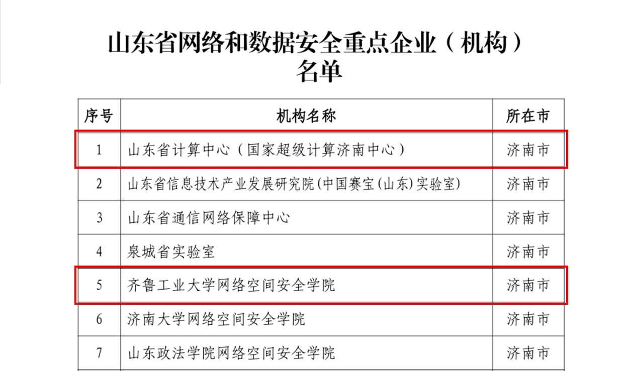 近日,山东省委网信办,山东省工业和信息化厅联合组织开展山东省网络和数据安全重点企业(机构)库建设工作,经过单位申报 91香蕉视频,初审,专家评审等严格程序,共遴选出147家重点企业和33家重点机构,计算学部山东省计算中心(国家超级计算济南中心),网络空间安全学院凭借卓越的科研能力,良好的人才培养质量和突出的经济社会效益,成功入选山东省网络和数据安全重点机构名单。