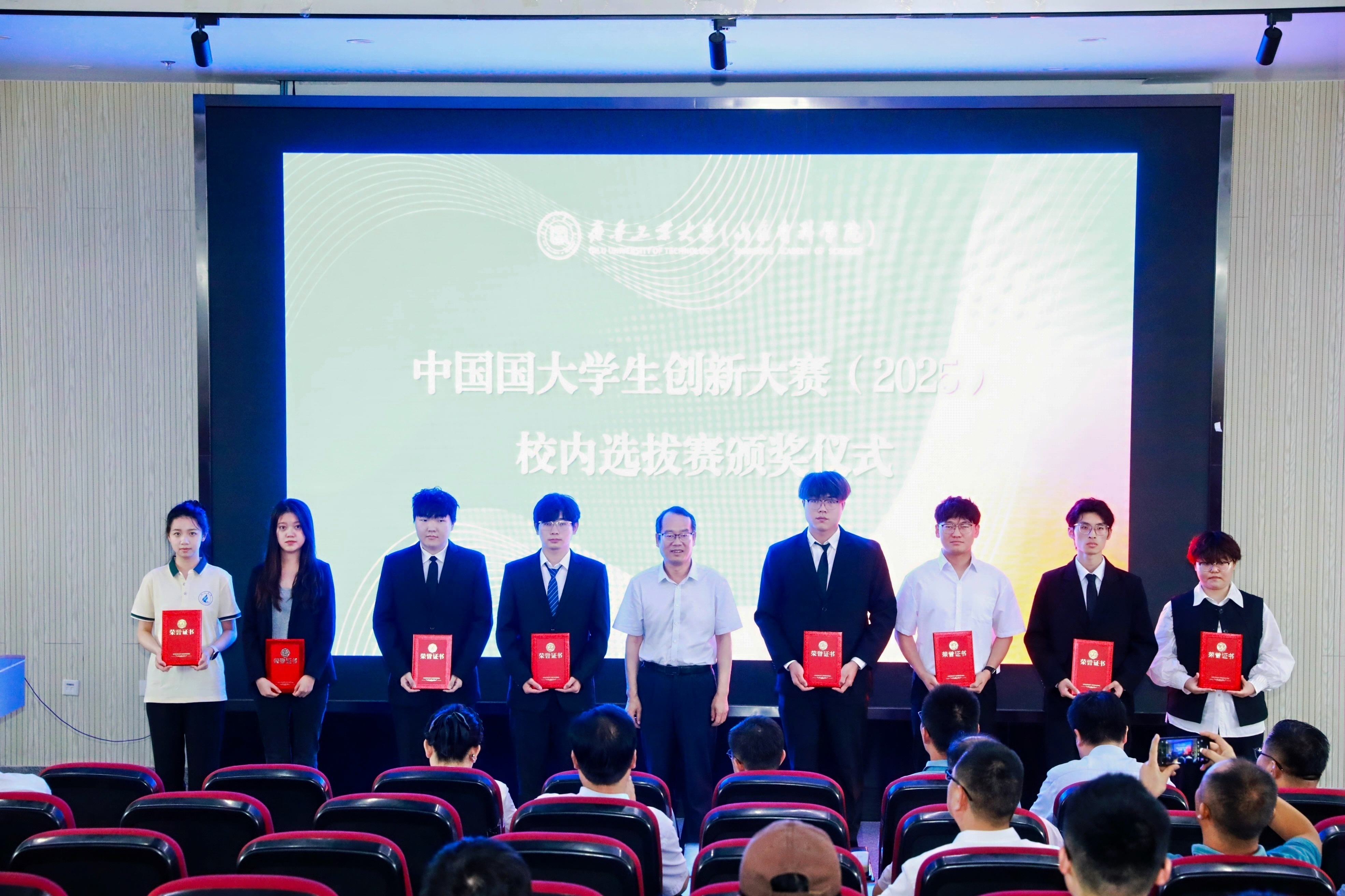 活动中,许崇海,教务处处长姜海辉分别为中国大学生创新大赛(2025)校内选拔赛获得一,二等奖的项目团队代表颁发证书 91黄,许崇海为参加校(院)青年红色筑梦之旅活动的学生代表授旗。