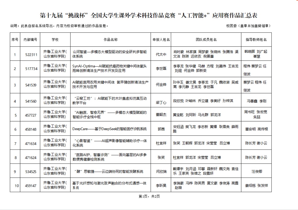 根据《“挑战杯”全国大学生课外学术科技作品竞赛章程》和“人工智能+”专项赛的报备要求,学校(科学院)拟推报以下20件项目作品参加应用赛,现予以公示 91香蕉视频。