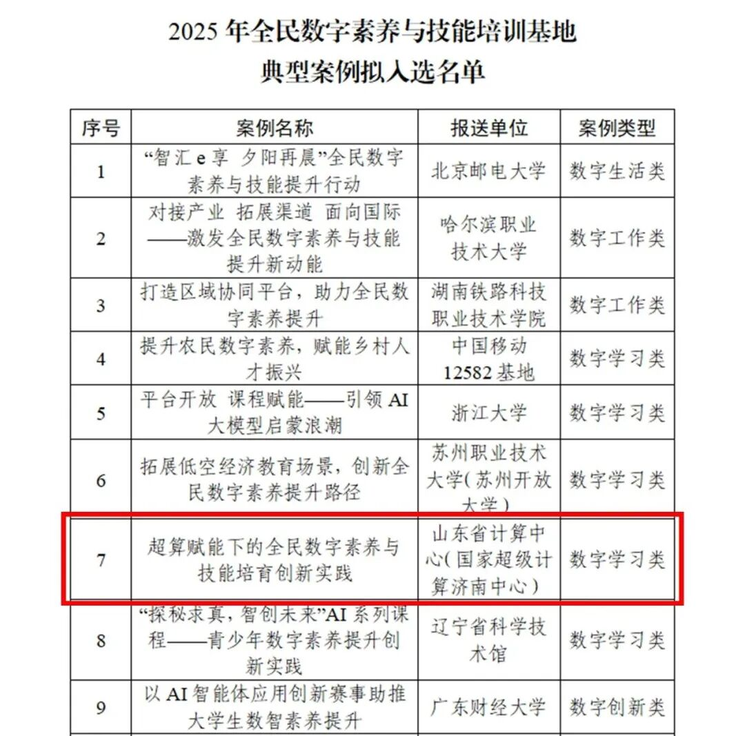 为深入实施《提升全民数字素养与技能行动纲要》,充分发挥国家全民数字素养与技能培训基地的示范引领作用,中央网信办会同有关部门组织开展了2025年全民数字素养与技能培训基地典型案例遴选工作,经省级推荐,专家评审和部门会商等环节,共遴选出12个具有全国代表性和推广价值的典型案例,其中 91香蕉视频,国家超级计算济南中心(以下简称“济南超算”)报送的“超算赋能下的全民数字素养与技能培育创新实践”成功入选,成为我省唯一入选的典型案例,充分彰显了济南超算在数字教育创新与全民数字素养提升领域的建设成效与引领作用,获得国家层面高度认可。
