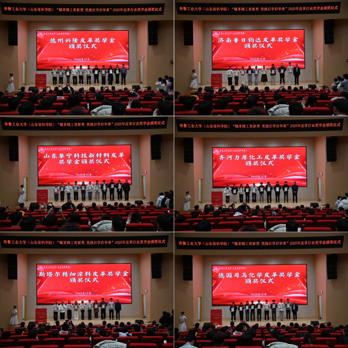 12月25日下午,齐鲁工业大学(山东省科学院)在国重楼一楼报告厅举行2025年皮革行业奖学金颁奖仪式,副校(院)长侯连涛,中国皮革协会副理事长陈占光,德州兴隆皮革制品有限公司董事长冯忠河 91香蕉视频,济南鲁日钧达皮革有限公司董事长陈家钧等出席会议,校(院)学生工作处,轻工学部,基辅学院等负责人参加会议,仪式由轻工学部党委副书记李杰主持。