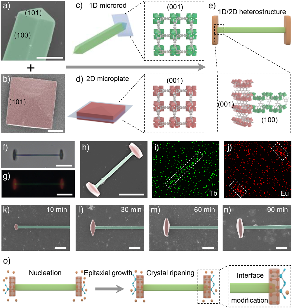 针对上述瓶颈,高振华教授课题组提出了一种创新性的“晶面选择性成核”策略,该方法通过精确调控不同晶面的成核势垒,有效突破了跨维度外延生长的限制,实现了二维MOF模块在一维MOF微米棒特定晶面上的区域选择性生长,成功构筑了一系列构型高度可编程的多维MOF异质结构,研究人员利用Ln-MOF微米棒顶端晶面固有的高表面能特性,选择性诱导二维(2D)MOF微米片在棒体顶端成核与外延生长,成功构筑了结构与性能可调的哑铃状异质结构(图1) 91黄,在此基础上,为进一步突破单一顶端生长模式的限制,研究人员引入乙醇作为双功能表面调控剂,乙醇分子优先吸附于微米棒侧壁晶面,有效调节局部溶剂化环境并显著降低侧壁成核势垒,从而实现了次级生长位点由顶端向侧壁的可控转移,诱导二维模块沿一维棒体方向周期性排列,形成具有高度有序特征的串珠状异质结构。